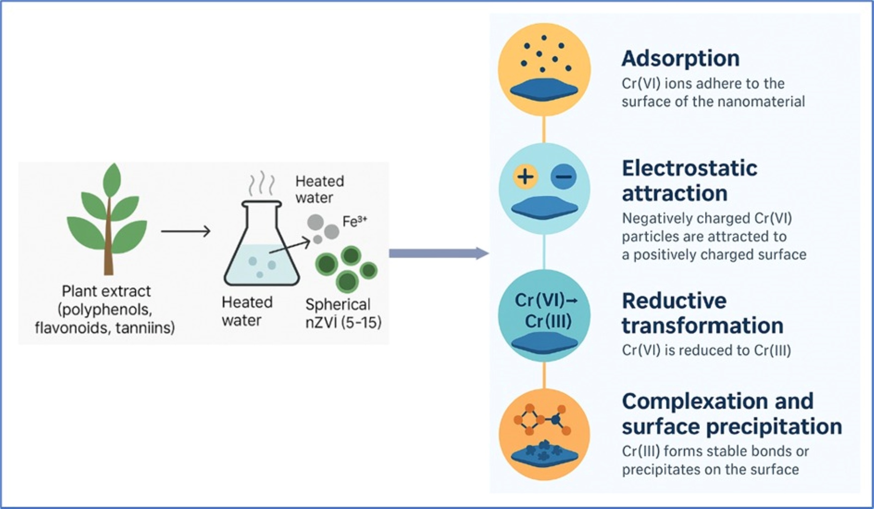 - Cr (VI) removal using nanomaterials involves interconnected mechanisms such as adsorption, electrostatic attraction under acidic conditions, reductive transformation to Cr (III), and subsequent complexation or surface precipitation of Cr (III) on the nanomaterial surfaces.