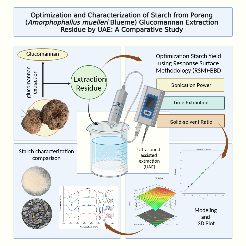 Amylose, Sonication power, Solid-solvent ratio, Starch characterization, Extraction optimization, UAE, Porang residue, RSM, Sustainable practicesAbstract
