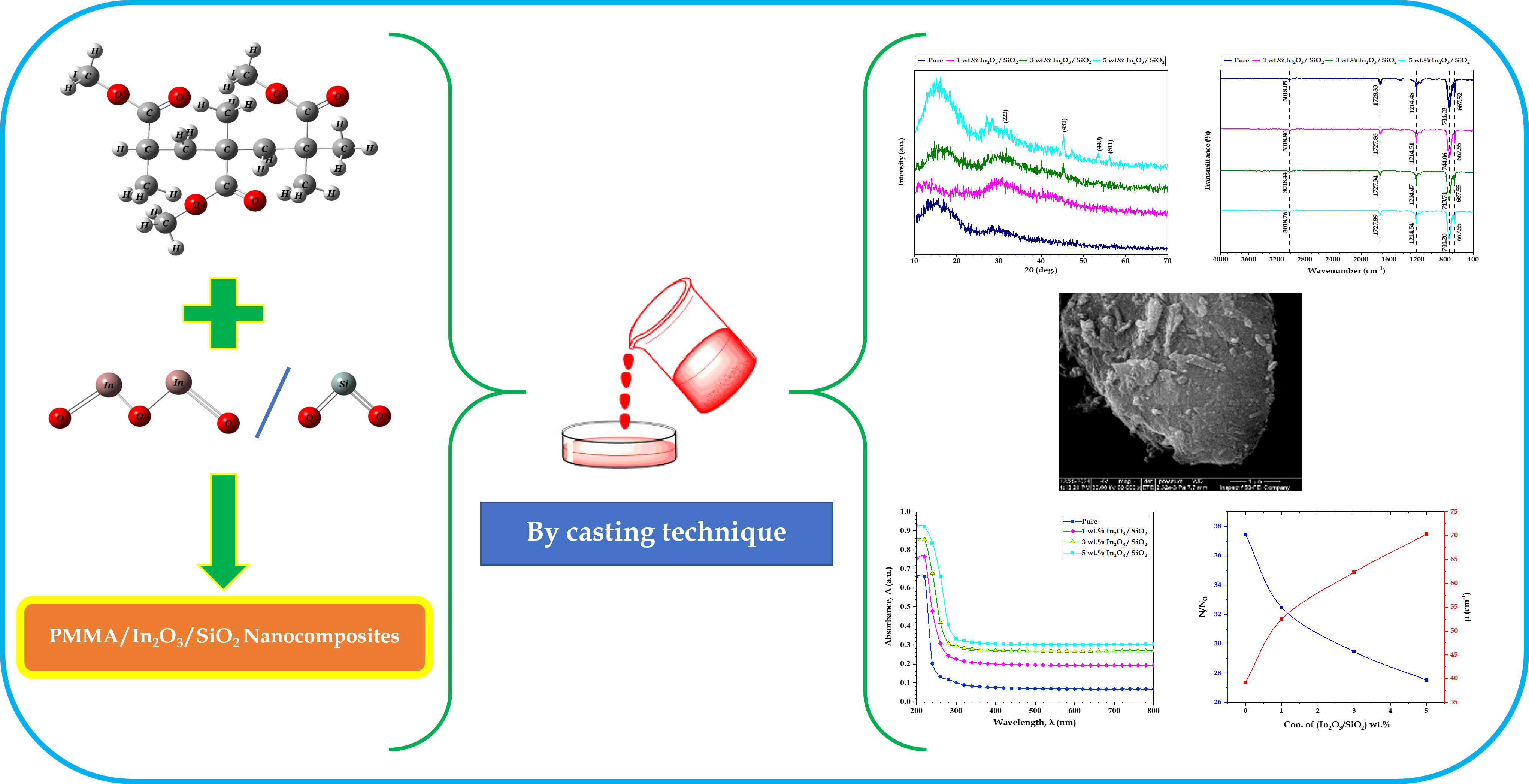 - FESEM analysis confirms the homogeneous distribution of In2O3/SiO2-NPs in the PMMA matrix, with slight aggregation at higher contents.